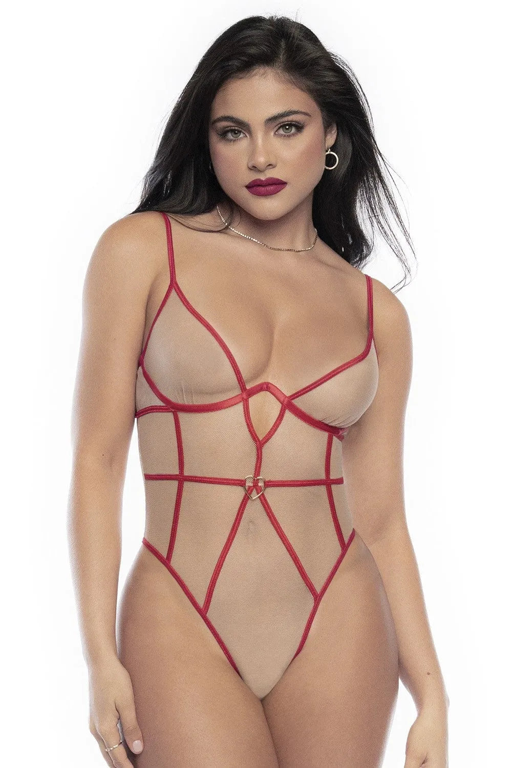 PromoBody Lingerie FemmeBody lingerie femme résille chair, coutures rouges, armatures, cœur métal, bretelles réglables, dos ouvert élégant.